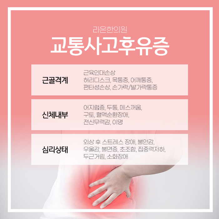 평소 목이나 허리가 약했던 분은 작은 충격에도 해당 부위의 통증이 심하게 나타날 수 있고 심리적인 후유증이 더 두드러질 수 있습니다. 척추와 무관해 보여도 후유증일 수 있습니다. 척추와 직접적인 관련이 없어 보이거나 겉으로 보기에 신체적인 문제와 연결 짓기 어려운 증상도 모두 교통사고 후유증에 포함될 수 있습니다.