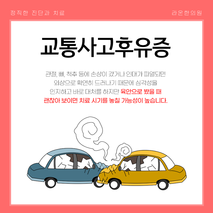 교통사고가 발생한 후에 남는 목, 어깨, 허리 통증이나 두통, 어지럼증 등 다양한 불편함들을 효과적으로 치료하고 후유증 없이 온전히 회복하기 위해서는 사고 규모나 겉으로 보이는 외상 유무와 관계없이 사고 초기부터 작은 신체적인 변화까지도 놓치지 않고 꼼꼼하게 진단받고 치료받는 것이 중요합니다.