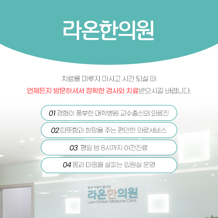 그렇게 되면 피로가 계속 쌓이고 결국 감기나 다른 염증성 질환 등 또 다른 질환까지 생기게 되는 악순환이 반복될 수 있습니다. 사람마다 타고난 성격이나 기질이 다르듯이 안타깝게도 교통사고 후에 나타나는 아픔이나 불편한 증상도 모두 다르게 나타납니다.