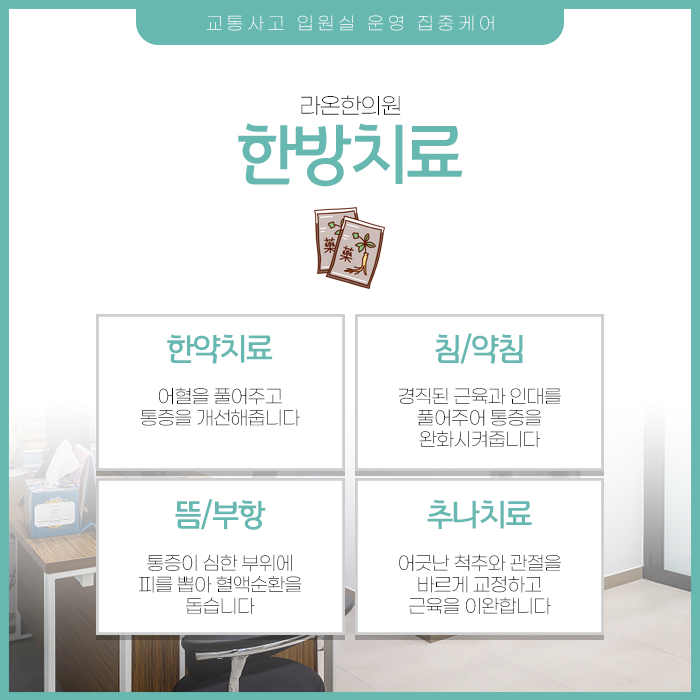 교통사고를 겪은 후에 위에서 언급한 내과적, 심리적 증상들이 겉으로 보기에 경미하거나 미미하게 조금이라도 느껴진다면 대전입원실한의원 진찰받아보시는 것이 좋습니다. 지금은 증세가 경미하더라도 시간이 지나면서 몸의 긴장이 풀리고 손상 부위에 염증이 진행됨에 따라 어떻게 심해질지 모르기 때문에 후유증이 만성화되기 전에 예방하고 적극적으로 대처하려는 자세가 필요합니다.