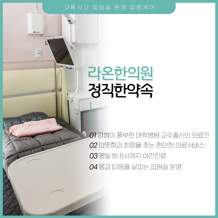 교통사고로 인해 몸에 상당한 충격과 무리가 가해졌다면 집중적으로 관리받기 위해 대전입원실한의원 입원치료도 고려해 볼 수 있습니다. 자신의 불편함을 제대로 살피지 못해 치료 시기를 놓치게 된다면 초기에는 쉽게 치료될 수 있었던 증상이 오래도록 지속되는 상태가 되어 오랜 기간 고생해야 할 수도 있습니다.