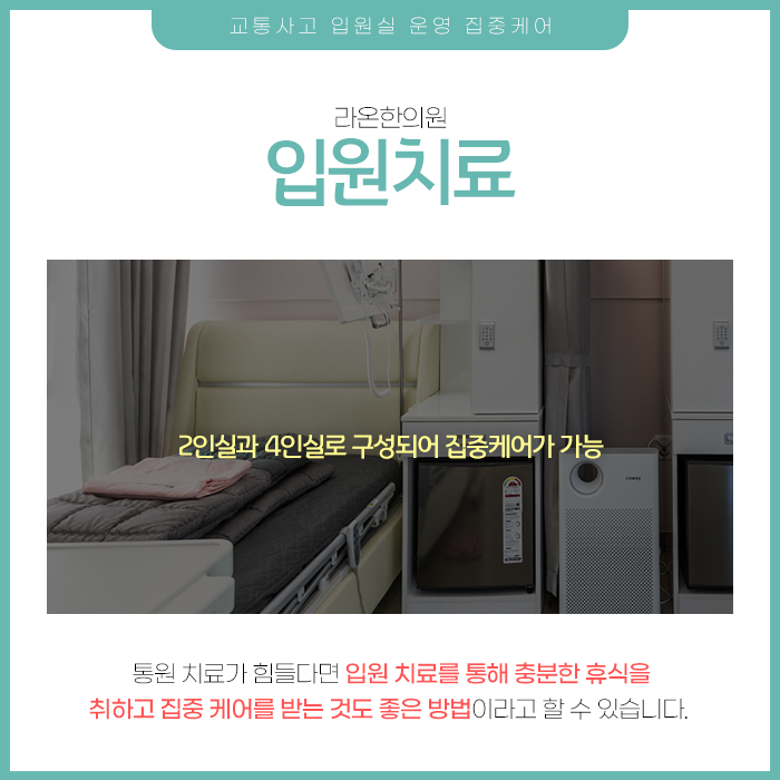 한약은 어혈을 제거하고 염증을 가라앉히며 심신을 안정시키는 효과가 있는 한약재를 체질과 증상에 맞춰 처방합니다. 침치료는 통증을 완화하며 자율 신경계를 조절하여 심리적인 안정을 돕습니다.