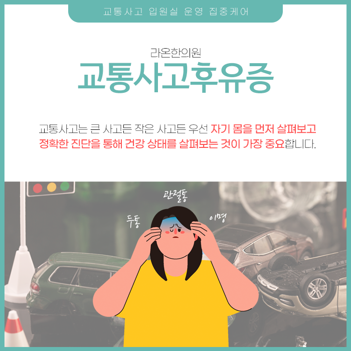 단순히 사고로 인해 다친 부위가 아픈 것만을 의미하는 것이 아니라 몸 전체의 기능과 균형이 깨지면서 나타나는 복합적인 증상들을 의미합니다. 교통사고 후유증은 획일적인 방식으로 치료하기 어렵습니다. 왜냐하면 개인의 체질, 건강 상태, 사고 당시 상황, 나타나는 증상들이 모두 다르기 때문입니다.