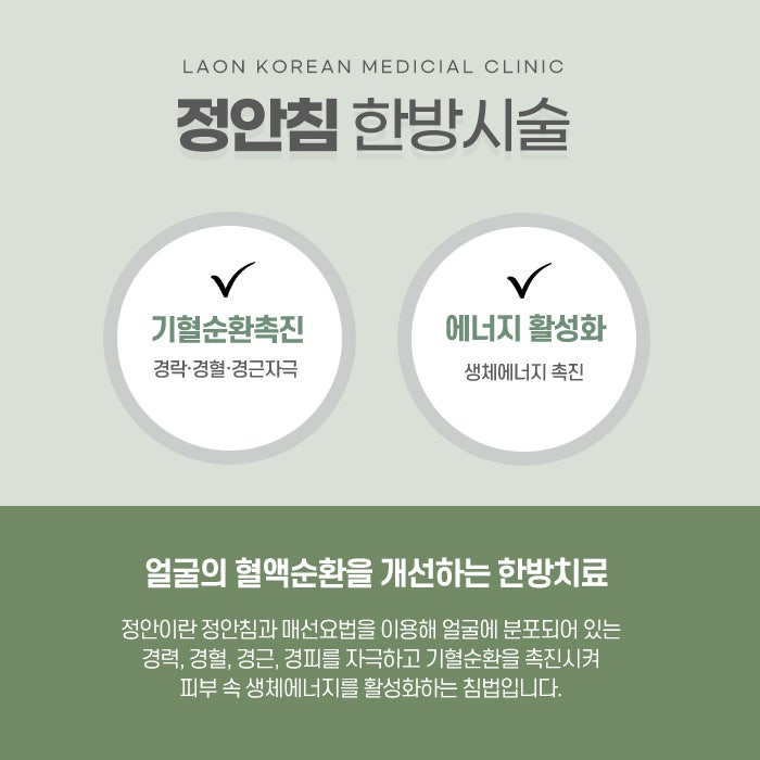 동안침이라는 명칭도, 이러한 치료법이 사람의 정신적, 신체적 나이를 돌려주는 데 도움이 된다는 의미에서 유래된 것으로, 안면 미용이나 피부 개선을 위한 기능도 포함하고 있습니다. 정안침은 단순히 외모를 위한 치료에 그치지 않고, 체내의 에너지 흐름과 내부 균형을 맞추어 사람의 전반적인 건강을 회복시키는 데 중점을 두고 있습니다. 대전정안침은 기본적으로 한방에서 사용되는 다른 침술 기법들과 마찬가지로, 경혈에 침을 놓아 신체의 에너지를 조절하고 치유를 촉진하는 원리로 작용합니다. 이 과정에서 사용하는 경혈은 신체의 에너지 흐름에 중요한 역할을 하는 지점들로, 이 지점들에 자극을 주면 기와 혈의 흐름이 원활해지고, 그로 인해 체내의 불균형 상태가 해소됩니다.