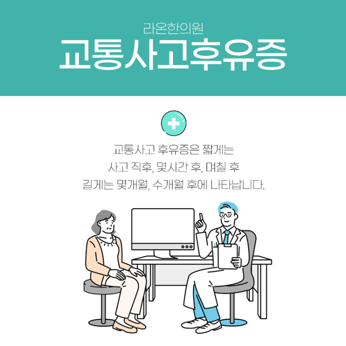 사고 직후에는 통증이나 불편함을 제대로 인지하지 못하거나 별다른 불편함이 없더라도 시간이 흐르면서 그때부터 특정 부위가 뻣뻣해지거나 통증이 나타나고 다른 문제가 서서히 발생할 수 있습니다. 겉으로 드러난 외상이 없으니 쉬면 저절로 나아지겠지라고 생각하고 염증이 심화되거나 굳어지면서 나중에 다른 질환으로 이어지거나 만성적인 상태로 고착될 수 있다는 것을 간과해서는 안 됩니다.