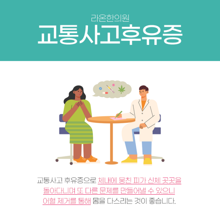 단순히 피곤해서 그런가 보다하고 가벼운 근육통으로 여길 수 있는 증상이라 할지라도 시간이 지나도 나아지지 않고 오히려 점점 더 심해지거나 다른 증상을 동반하는 경우가 많습니다. 교통사고 당시 몸 안에 직접적인 출혈이 없었더라도 강한 충격으로 인해 혈관이 손상되면서 어혈이 생기는 경우가 있습니다.