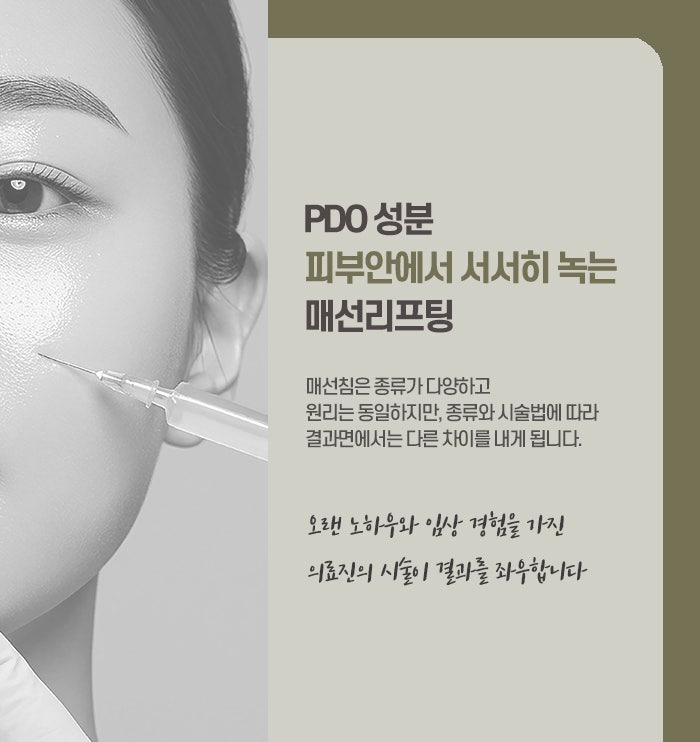 안면 비대칭이 있지만 수술이 필요할 정도는 아닌 경우, 또는 수술 없이 점진적으로 개선을 원하거나 얼굴에 인위적인 변화가 생기는 것이 꺼려지는 경우, 매선은 피부 안쪽에서 자연스럽게 변화를 유도하므로 부담 없이 적용할 수 있습니다. 매선 치료는 개인의 얼굴 구조, 근육 상태, 피부 탄력, 습관 등을 종합적으로 평가한 후 진행되어야 하며, 단순히 눈에 띄는 좌우 차이만을 보고 시술하는 것은 적절치 않습니다. 진단을 통해 어떤 근육이 원인인지, 어떤 조직이 기능 저하 상태인지 등을 파악하고, 그에 따라 실의 위치, 방향, 깊이, 종류를 결정하는 것이 치료의 핵심입니다.