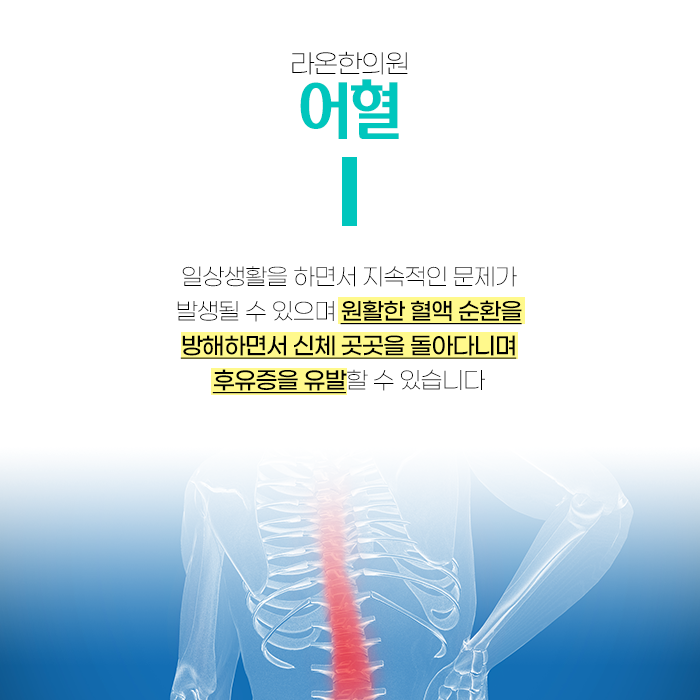 교통사고는 몸에 갑작스럽고 강한 물리적 충격을 가합니다. 이 충격으로 인해 겉으로 보이는 상처가 없더라도 내부에 미세한 손상이 발생할 수 있습니다. 한의학에서는 사고 충격으로 인해 혈액이 정상적으로 순환하지 못하고 한 곳에 뭉쳐 정체된 상태를 어혈이라고 진단합니다.
