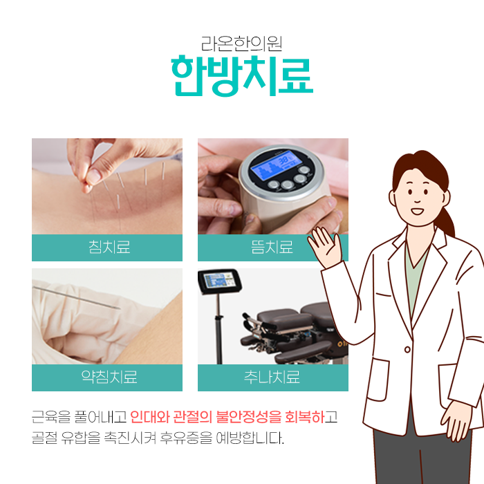 아직 눈에 띄는 심각한 증상이 명확하게 나타나지 않았다 하더라도 잠재적인 문제가 발생했을 가능성을 염두에 두고 앞으로 발생할 수 있는 후유증을 미리 예방하는 차원에서 조기에 용전동입원한의원 진료를 받아보시는 것도 좋은 방법입니다.