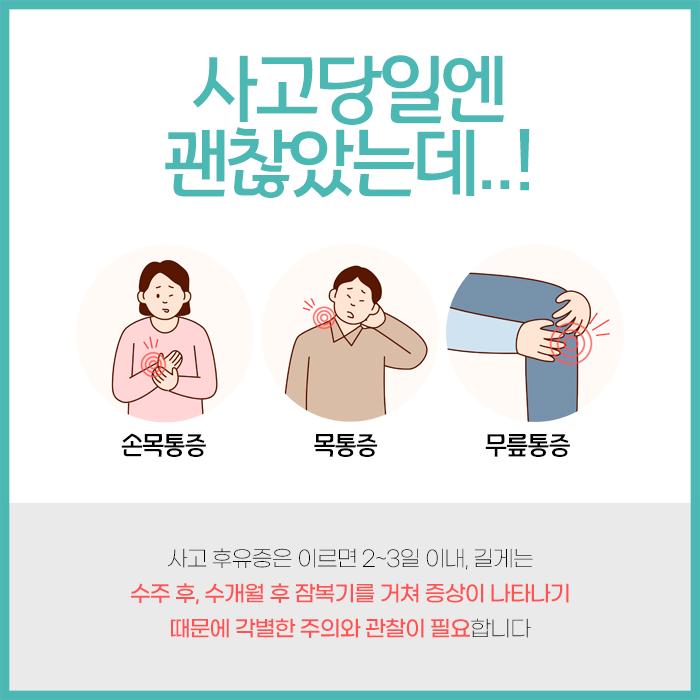 사고 후에는 신체를 꼼꼼하게 살펴보고 내과적 증상이나 심리적 증상이 없는지 확인해야 합니다. 후유증은 증상이 다양하고 복합적이며 개인의 체질과 사고의 충격 정도에 따라 다르게 나타납니다. 대전야간진료한의원을 통해 한방치료를 진행해 보시는 것을 권해드립니다.