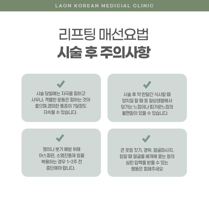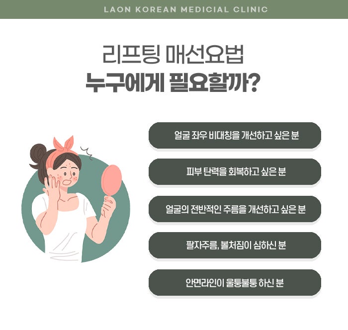 또한, 시술이 간단하고 회복 시간이 짧으며, 일상생활로 바로 복귀할 수 있다는 큰 장점이 있습니다. 그러나, 이 시술은 일시적인 변화를 제공하므로 꾸준한 관리와 추가적인 시술이 필요할 수 있습니다. 따라서, 매선요법을 고려하는 사람은 의료진과의 충분한 상담을 통해 자신의 상태에 맞는 치료 계획을 세우고, 보다 자연스럽고 만족스러운 결과를 얻을 수 있도록 해야 합니다. 얼굴 처짐살을 개선하고 자연스럽고 탄력 있는 얼굴 윤곽을 되찾기 위해 매선요법은 매우 유효한 방법이 될 수 있습니다.