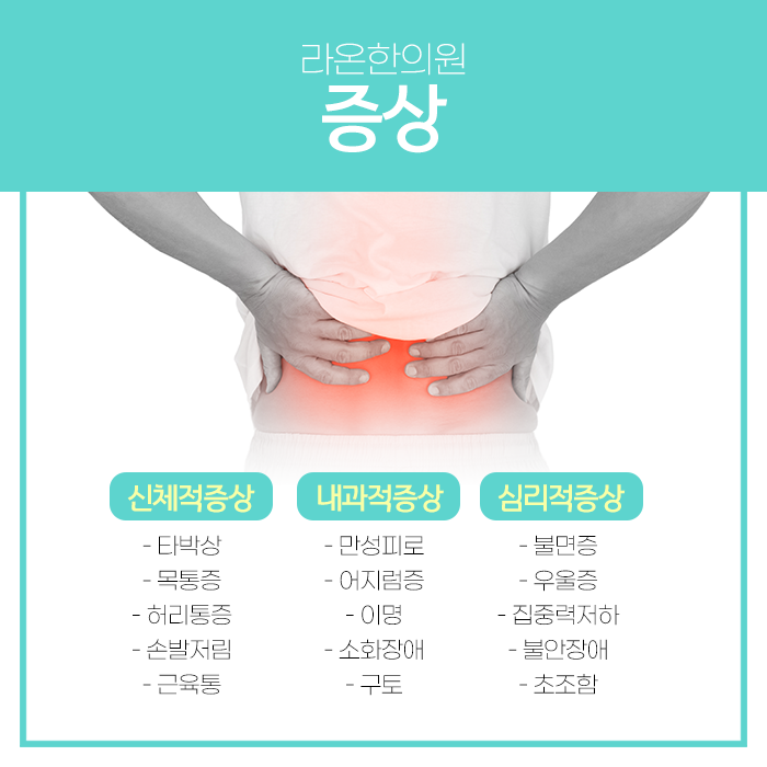 몸은 연결되어 있기 때문에 한쪽에 불편한 증상이 지속된다면 다른 곳까지 영향을 미치게 됩니다. 목 통증이 심하면 두통으로 이어지고 다시 수면 장애를 유발하여 피로감을 가중시키는 식입니다.