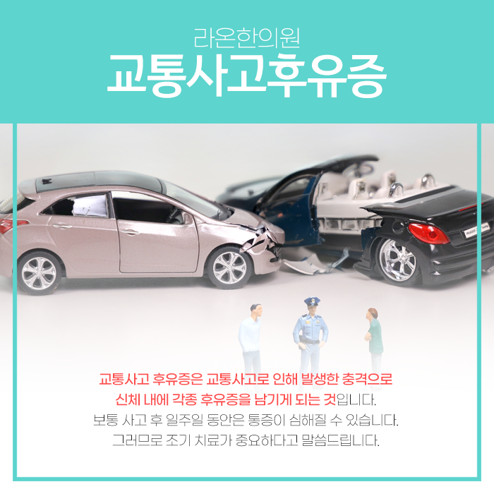그러나 사고 직후 차량 수습에만 몰두하기보다 신체 상태를 면밀히 살피고 언제든지 나타날 수 있는 후유증 예방에 힘써야합니다. 교통사고 시 발생하는 물리적인 충격은 겉으로 보이는 상처가 없더라도 연부 조직에 미세한 손상을 입힐 수 있습니다. 교통사고 후유증을 대수롭지 않게 여기고 방치할 경우 증상이 점차 악화되어 불편함을 넘어 심각한 문제로 발전할 수 있습니다.