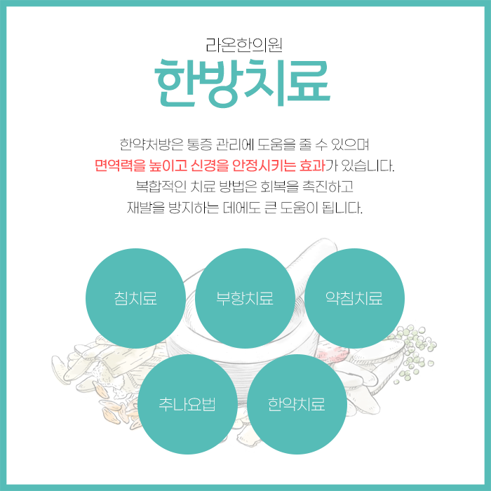 개인의 체질과 증상에 맞춘 한약은 몸속 어혈을 제거하고 기혈 순환을 개선하며 면역 체계를 강화하여 신경의 과민 반응을 줄이고 재발을 방지합니다.