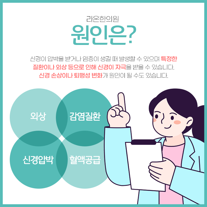 외상, 대상포진 후 신경통 같은 신경계 질환으로 인해 신경을 보호하는 수초가 손상되거나 신경 자체에 염증이 생긴 경우에도 대전 삼차신경통이 발생할 수 있습니다. 다양한 원인이 복합적으로 작용할 수 있으며 때로는 명확한 원인을 파악하기 어려운 경우도 있습니다.