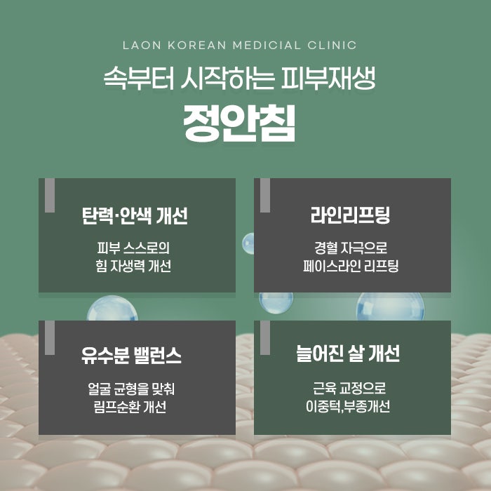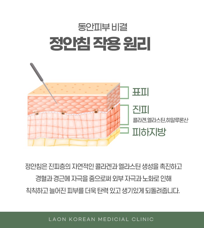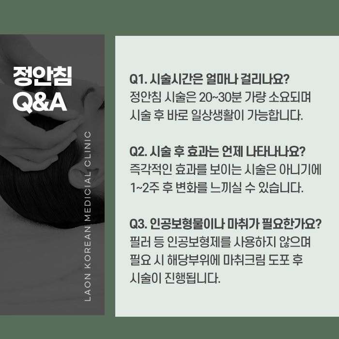 정안침은 비수술적 방법으로 동안 얼굴을 만들어주는 시술입니다. 침술을 통해 피부와 근육에 자극을 주어 혈액 순환을 촉진하고, 피부의 재생을 유도하여 주름 개선과 탄력 회복을 도와줍니다. 이 방법은 수술 없이 얼굴 윤곽을 자연스럽게 개선할 수 있는 장점이 있으며, 다양한 연령대에서 예방적 차원에서 또는 개선을 위한 시술로 유용하게 사용될 수 있습니다. 시술 후에는 적절한 관리가 필요하지만, 일상생활에 큰 지장이 없고 회복이 빠르다는 점에서 많은 사람들이 선호하는 시술입니다.