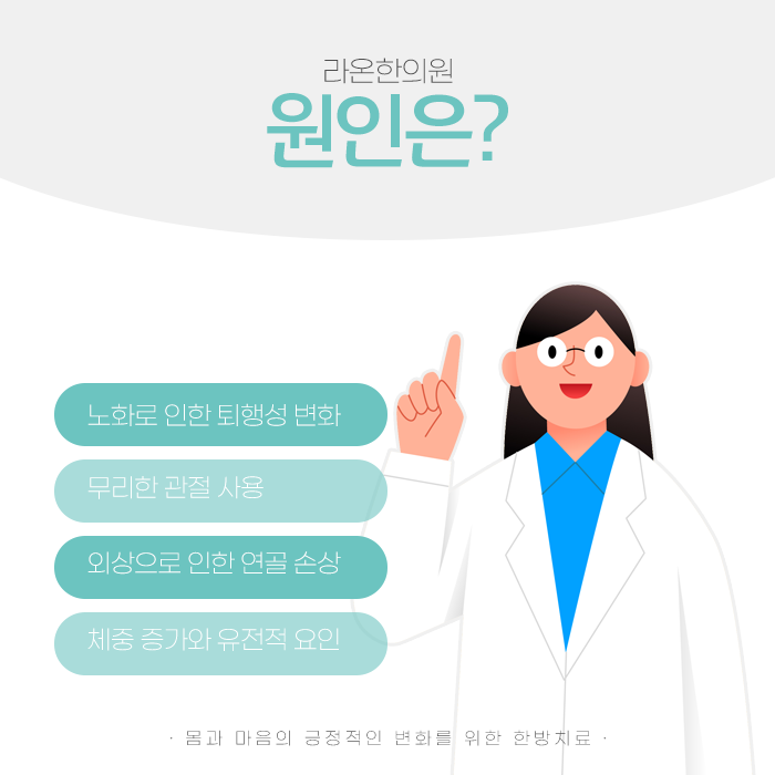 주로 50대 이상의 중장년층에게서 관찰되지만 최근에는 40대 미만의 연령층에서도 발생 빈도가 늘고 있습니다. 간헐적으로 통증이 나타나지만 이를 방치하게 되면 연골의 손상이 심화되어 관절의 변형은 물론 보행에 어려움을 겪는 상태로 진행될 수 있습니다.