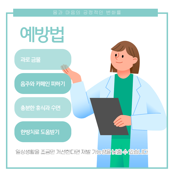 또한, 몸의 균형 기능에 좋지 않은 영향을 줄 수 있고 대전 어지럼증을 유발하거나 악화시킬 수 있는 카페인이 다량 함유된 음료, 니코틴 등이 함유된 담배 등은 가급적 피하거나 제한하는 것이 좋습니다. 어지럼증 치료를 위해 다양한 관리 방법들을 활용할 수 있습니다.
