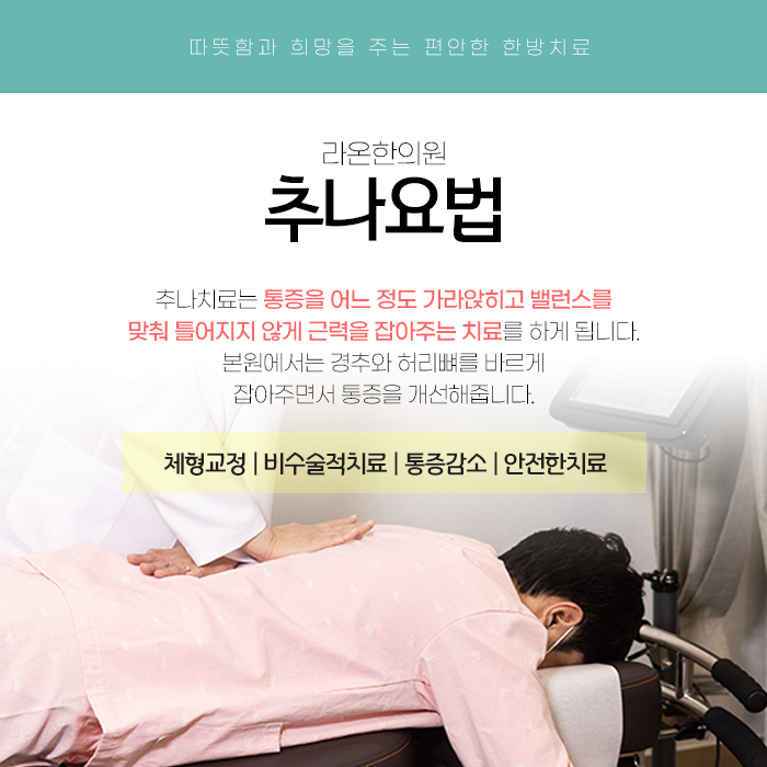 대전교통사고치료한의원 약침치료는 손상된 근육과 인대 조직의 재생을 돕고 염증을 빠르게 진정시킵니다. 추나요법은 비뚤어지거나 어긋난 뼈와 근육의 균형을 직접 손으로 정상적으로 되돌려 놓는 수기 치료법입니다.