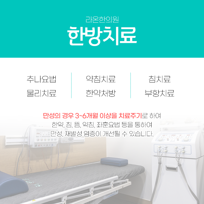 발병 기간이나 증상의 심한 정도, 개인의 체질과 회복력에 따라 치료 기간은 개인마다 차이가 있을 수 있습니다. 반복되는 염증은 만성으로 이어질 수 있습니다. 몸의 기혈 순환을 원활하게 하여 스스로 질환에 저항할 수 있는 힘을 키우는 데에는 한방치료 도움을 받아보시는 것이 도움 될 수 있습니다.
