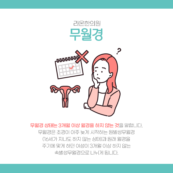 매달 규칙적으로 이루어지던 생리가 갑자기 멈추었다면 가볍게 여길 일이 아닙니다. 임신 중에는 자연스럽게 생리가 중단되지만 이유 없이 생리가 멈췄다면 몸에 어떤 문제가 발생하고 있다는 신호일 수 있습니다. 생리는 21일에서 35일 간격으로 나타나는데 6개월 이상 생리가 없는 경우를 무월경으로 간주합니다.