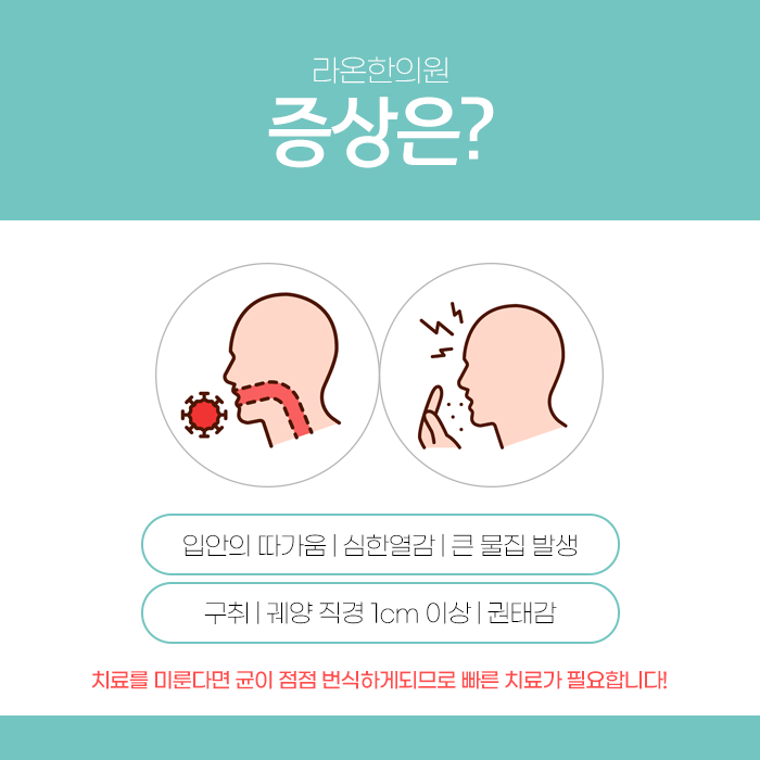 입안이 화끈거리거나 따끔거리고 음식을 먹거나 말할 때 통증이 심해집니다. 작고 둥근 흰색 또는 붉은색 수포나 궤양 형태로 나타납니다. 궤양 주변은 붉게 부어오르는 경우가 많습니다. 심한 경우에는 입안에 염증과 세균 번식으로 인해 입냄새가 동반되기도 합니다. 대전 구내염은 보통 1~2주 이내에 자연적으로 호전되는 경우가 많습니다.