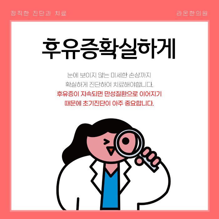 비록 외부로 드러나는 외상이나 출혈이 눈에 띄지 않더라도 사고 순간 목이 채찍처럼 흔들리거나 허리에 뒤틀림이 발생하면서 근육, 인대, 신경에 미세한 손상이 생기거나 어혈이 형성될 수 있습니다. 미세한 내부 손상들은 검사로도 명확하게 확인하기 어려운 경우가 많습니다. 하지만 몸이 보내는 통증이나 불편감의 원인이 되어 시간이 지나면서 점차 악화되는 후유증으로 발전하게 됩니다.
