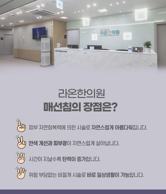 매선요법은 이러한 얼굴비대칭 문제를 비수술적으로 개선할 수 있는 방법으로, 피부와 근육, 지방층을 동시에 자극하고 재생을 촉진하여 자연스러운 얼굴 균형을 회복하도록 돕습니다. 매선요법을 통해 얻는 변화는 자연스럽고 균형 잡힌 얼굴 윤곽뿐만 아니라, 자신을 아끼고 돌보는 시간을 제공하며, 그 과정에서 느끼는 만족과 행복은 외적인 변화 이상의 소중한 경험이 됩니다. 스스로를 사랑하고 꾸준히 관리하며 건강한 생활을 실천한다면 누구나 자연스럽고 균형 잡힌 얼굴을 유지할 수 있으며, 매선요법은 그 여정을 도와주는 따뜻하고 의미 있는 시술이라 할 수 있습니다.