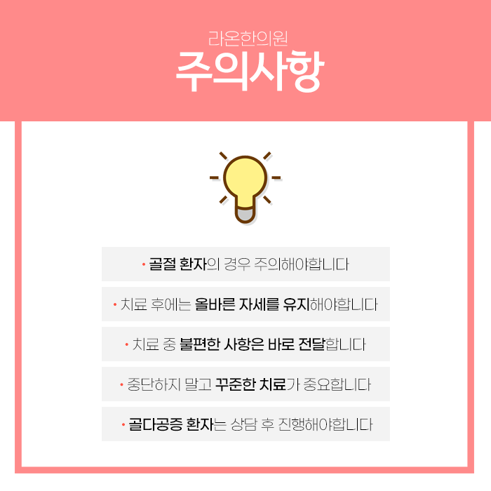 여기에 한의학 치료법을 함께 진행하면 치료 효과를 극대화하여 회복력을 높이는 효과를 기대할 수 있습니다. 척추는 몸의 중심이자 상체를 지지하고 신경을 보호하는 중요한 부위입니다. 척추 관련 질환은 건강과 직결되며 개인마다 증상과 통증 정도, 원인, 타고난 체질이 서로 다르기 때문에 치료 기간과 예후에도 차이를 보일 수 있습니다.