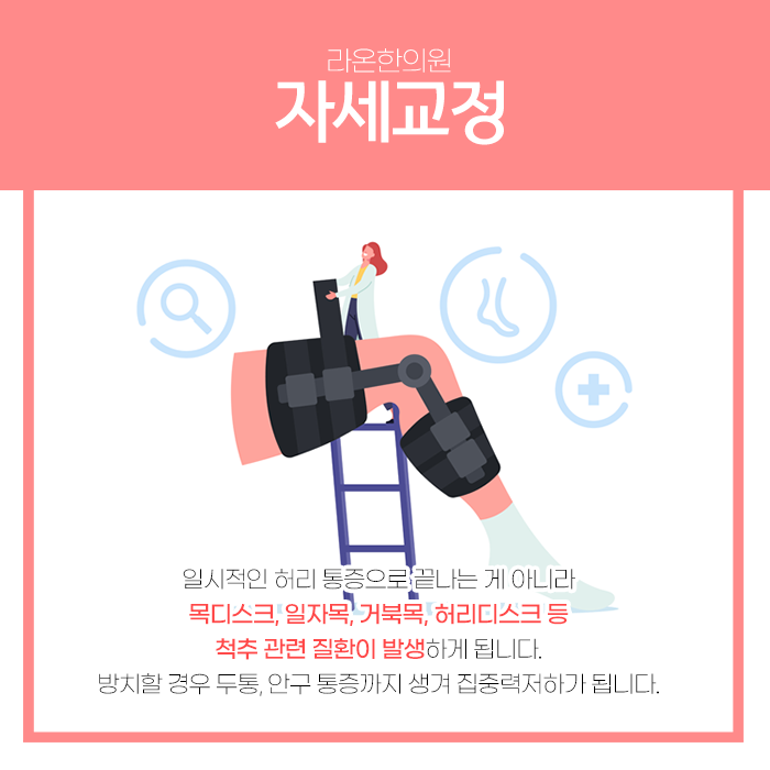 장시간 잘못된 자세가 반복되면 척추의 자연스러운 곡선이 변형되거나 일자목, 거북목, 허리디스크 등으로 이어지는 경우가 많습니다. 사무직 근무자분들에게는 장시간 앉아서 일하는 환경이 일상화되면서 다양한 척추와 관절 문제가 증가하고 있습니다. 흔하게는 염좌나 만성 근육통, 눈에 띄는 체형 불균형으로 인해 불편함을 호소하는 분들이 많아졌습니다.