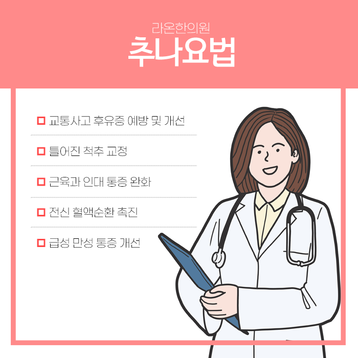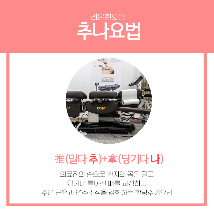 물리적인 조정을 통해 척추와 관절에 가해지는 비정상적인 부담을 줄이고 주변 근육의 긴장을 이완시켜 통증을 완화하고 움직임을 회복할 수 있습니다. 추나요법은 퇴행성 척추질환, 경추 염좌, 만성적인 통증, 척추측만증, 일자목, 거북목 등 다양한 관절 관련 증상에 효과적인 치료법으로 활용됩니다.
