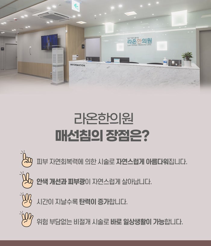코 주변에 대전한방성형매선을 시술할 경우 콧등을 살짝 정리하고 코라인을 세워 보다 또렷한 인상을 줄 수 있으며, 이러한 다양한 부위에 대한 개별적 접근이 가능하기 때문에 얼굴 전체를 조화롭게 개선하는 데 매우 좋은 방법이라 할 수 있습니다. 매선요법의 장점은 수술을 하지 않고도 얼굴형을 개선할 수 있다는 점에서 출발합니다. 절개나 마취가 필요 없고, 회복 시간이 짧아 일상생활에 지장을 주지 않으며, 시술 후 즉각적인 변화를 기대할 수 있는 동시에 시간이 지날수록 점진적인 탄력 개선과 피부 재생이 일어나는 것이 큰 특징입니다. 시술 과정에서 통증이 거의 없거나 매우 미미하고, 멍이나 붓기 또한 개인의 체질에 따라 다르나 일반적으로 가볍게 나타나며 수일 내에 회복되는 경우가 많습니다. 자연적인 콜라겐 생성이 동반되기 때문에 단순히 외적인 리프팅만이 아닌 피부 구조의 강화가 이루어지며, 시술이 비교적 오랜 기간 유지될 수 있습니다.