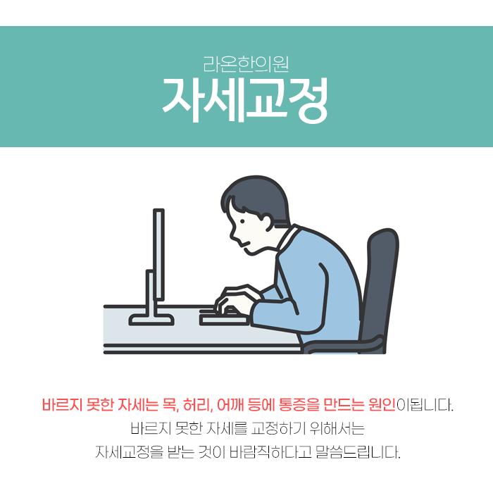 체형 문제를 느꼈다면 주저하지 말고 개인 몸 상태에 맞춘 교정 치료를 진행하는 것이 바람직합니다. 특정 부위에 지속적으로 부담이 가해지면 근육은 긴장 상태를 유지하게 되고 만성적인 근육 피로로 이어집니다. 바른 자세가 중요하다는 것을 알고 있음에도 불구하고 이를 스스로 바로잡는 것은 쉽지 않습니다. 이미 잘못된 자세에 익숙해져 있기 때문에 처음에는 바른 자세가 어색하고 불편하게 느껴질 수 있습니다.