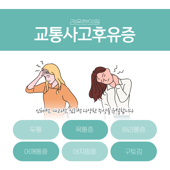 교통사고는 방어할 여유 없이 갑작스럽게 발생하기 때문에 사고 순간 가해지는 물리적인 충격은 몸에 다양한 형태로 영향을 미쳐 후유증이 뒤늦게 나타나는 경우가 많습니다. 운전자나 탑승객의 경우 경미해 보이는 접촉사고라고 하더라도 사고 당시에는 순간적인 통증의 억제로 인해 별다른 문제나 통증을 느끼지 못하는 경우가 흔합니다.