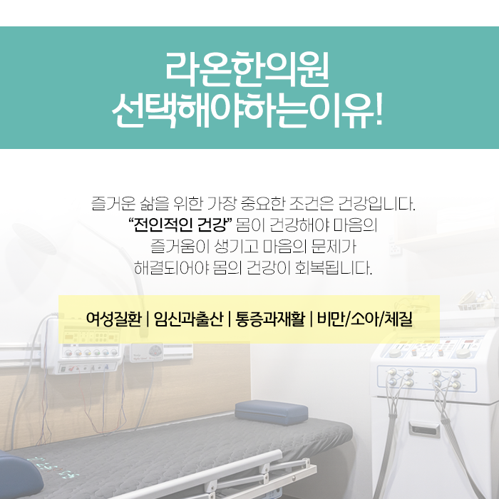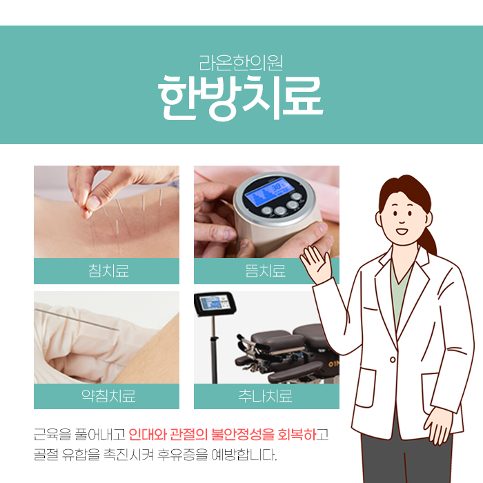 침치료를 통해 막힌 기혈을 소통시키고 통증을 경감하며 몸에 온기를 불어넣고 혈액 순환을 개선하는 뜸치료, 이완을 돕는 물리치료 등 다양한 한방치료법들을 상태와 증상에 맞춰 효과적으로 병행합니다.