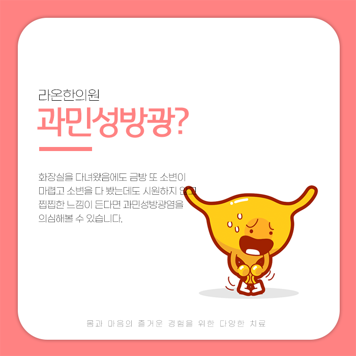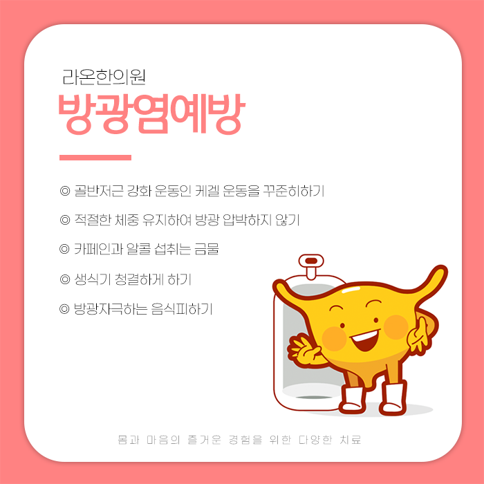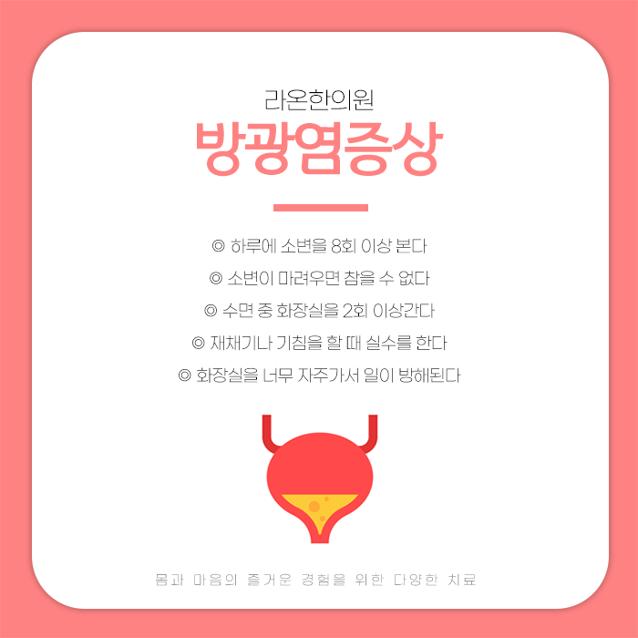 초기 단계부터 신장과 방광 기능을 강화하고 몸의 방어력인 면역력을 높이는 치료를 진행하는 것이 중요합니다. 한방치료와 함께 건강한 생활습관 관리가 병행될 때 치료 효과는 극대화됩니다. 카페인이나 탄산음료는 방광을 자극하여 소변이 자주 마렵게 하거나 요의를 참기 어렵게 할 수 있습니다.