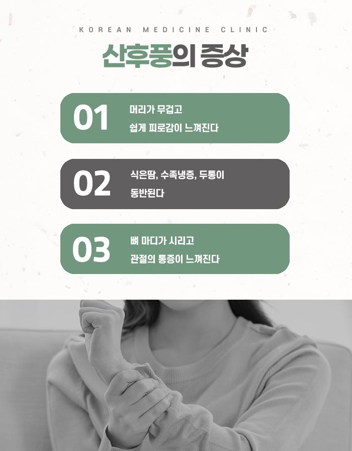 산후풍의 증상은 사람에 따라 매우 다양하게 나타나며, 가장 대표적인 증상은 관절통과 근육통입니다. 특히 손목, 무릎, 허리, 어깨, 발목 등의 관절 부위가 시리고 쑤시는 통증을 호소하는 경우가 많으며, 날씨가 흐리거나 비가 오기 전, 혹은 찬 바람을 쐬면 증상이 심해지는 경향을 보입니다. 이러한 통증은 단순히 피로감 수준이 아니라 일상생활을 어렵게 만들 정도로 지속되고 반복되기도 하며, 마치 류마티스 관절염이나 신경통처럼 느껴질 정도로 강한 통증을 동반하기도 합니다. 또한 관절이 붓거나 열감이 느껴지고, 움직일 때마다 삐끗하거나 소리가 나는 경우도 있으며, 몸 전체가 무겁고 늘어지는 느낌, 손발 저림, 냉증, 땀이 비정상적으로 많이 나는 등의 전신 증상이 나타날 수 있습니다. 이외에도 소화기능 저하, 두통, 어지럼증, 불면, 우울감, 산후 우울증과 같은 정신적인 증상까지 동반될 수 있어 육체적 고통을 넘어서 정서적인 부담도 함께 가중됩니다. 특히 이러한 증상들이 출산 직후에는 경미하게 느껴지다가 시간이 지날수록 점차 심화되거나 만성 통증으로 발전하는 경우가 많기 때문에 산후풍은 반드시 대전산후보약한의원을 통한 조기 관리와 적절한 치료가 필요한 질환입니다.