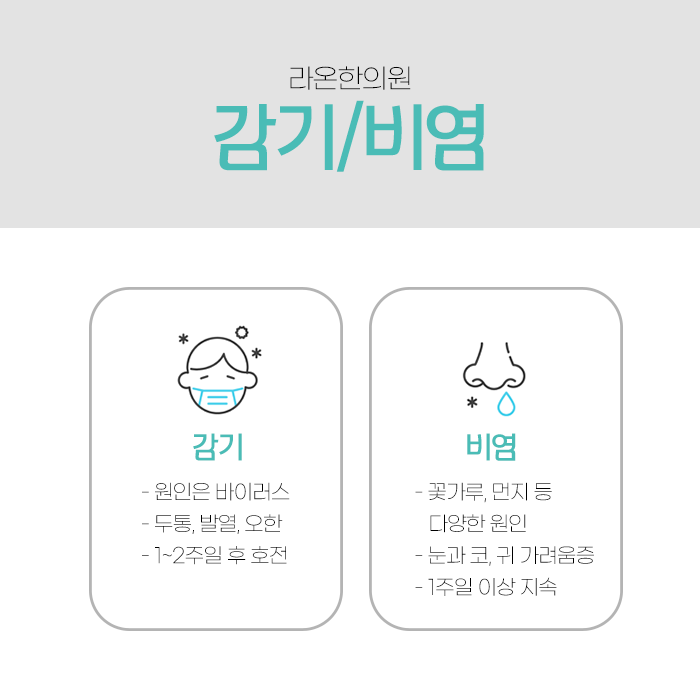 계절이 바뀌는 시기에 증상이 심해져 콧물이 많이 나오고 코막힘이 심해진다든지 맑은 분비물이 연속적으로 주르륵 흐르는 경우도 있습니다. 콧물이 코 뒤로 넘어가 목으로 넘어가 가래처럼 뱉어내거나 삼키려 하는 불편함을 자주 호소합니다.