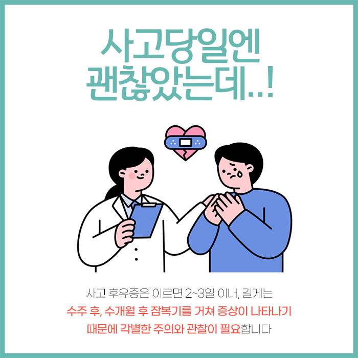 통증이 없다고 안심하기보다는 시간이 지나면서 몸의 긴장이 풀리고 호르몬 수치가 정상화되면 잠재되어 있던 손상 부위에서 통증이나 다른 불편감들이 드러나기 시작합니다. 교통사고 후 통증이나 불편감이 조금이라도 의심된다면 지체하지 말아야합니다. 손상된 부위를 제대로 치료하지 않고 계속 사용하면 시간이 흐르면서 통증과 불편이 나타나기 시작하며 만성화될 수 있습니다.