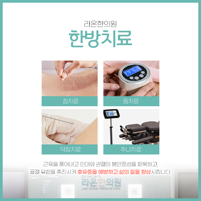 체질과 증상에 맞춰 어혈을 제거하고 회복을 촉진하며 기혈 순환을 개선하는 한약을 조제합니다. 침치료는 어혈 부위나 통증 부위의 경혈을 자극하여 근육 긴장을 이완시켜 통증을 완화합니다.