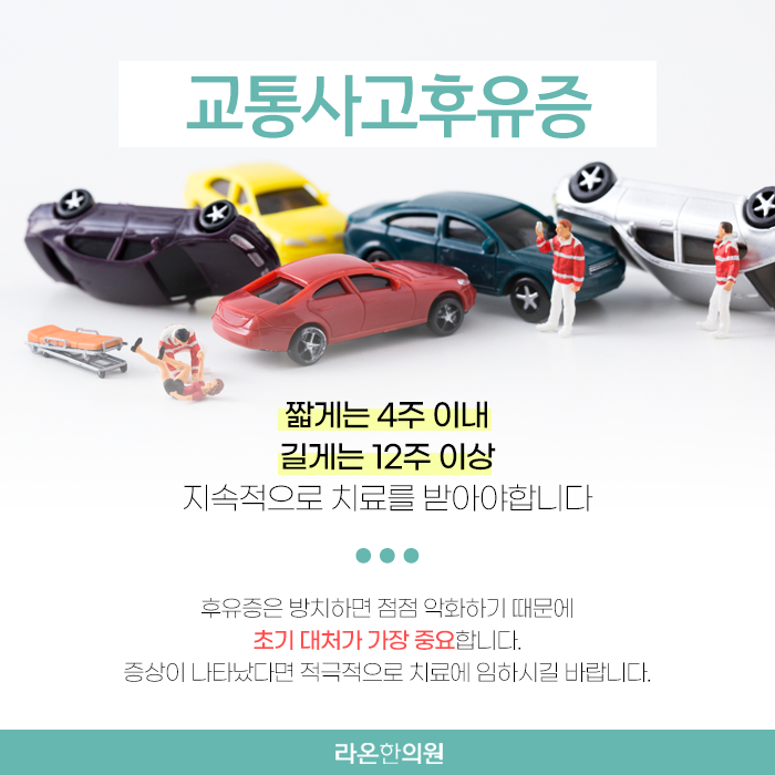 일반적으로 사고 후 2~3일 이내에 증상이 나타나기 시작하는 경우가 많지만 아드레날린 효과가 사라지고 긴장이 풀리면서 몇 주 또는 몇 달 뒤에야 후유증이 나타나기도 합니다. 교통사고 범위와 충격 부위, 체질까지 고려하여 진단을 내립니다.