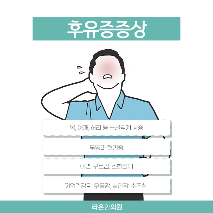 신체적 증상뿐만 아니라 내과적, 심리적 문제까지 동시에 발생할 수 있다는 점이 특징입니다. 목, 어깨, 허리 통증은 기본이며 저림, 뻐근함, 욱신거림 등 다양한 통증이 나타납니다. 구역감, 소화불량, 속쓰림, 복통 등 위장 기능 저하가 발생할 수 있습니다. 치료가 까다로운 이유는 사고 직후에는 뚜렷한 증상이 나타나지 않고 시간이 지나면서 점차 나타나기 때문입니다.