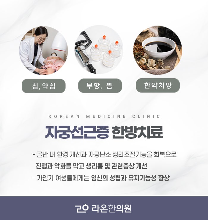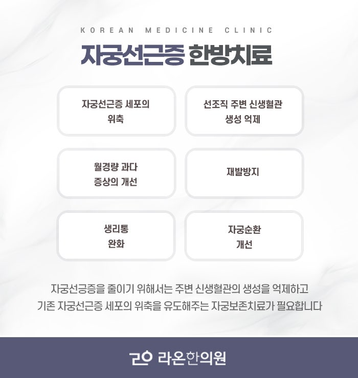 한의학에서는 자궁선근증을 전신의 기혈 순환 장애와 자궁 내부의 한기 및 정체된 혈액이 원인이라고 봅니다. 어혈은 혈액이 제대로 순환하지 못하고 특정 부위에 머무르며 통증과 덩어리를 형성하는 병리 개념으로, 자궁선근증의 주요 증상인 생리통과 혈괴, 자궁 비대 등의 상태와 밀접하게 연결됩니다. 특히 자궁 안의 혈이 순조롭게 흐르지 않고 뭉쳐 있는 상태가 계속되면 통증과 출혈이 심해지고 자궁이 정상적인 기능을 하지 못하게 되며, 이때 기의 흐름까지 막히면 전신적인 피로, 우울감, 소화불량 등으로 연결되기도 합니다. 또한 자궁이 냉한 상태가 되면 자궁의 기능이 저하되고 내막조직이 제대로 탈락되지 못해 자궁근층 내에 남아 문제를 일으키기 쉬워지므로, 자궁선근증은 반드시 몸의 온기를 보하고 어혈을 풀어주는 방식으로 대전선근증치료를 진행해야 합니다.