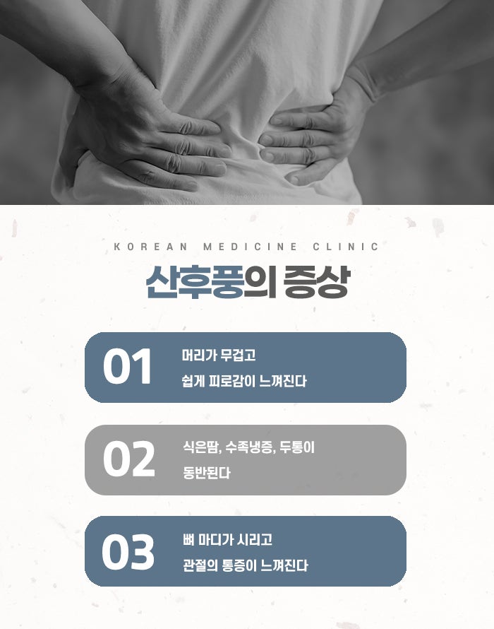 이러한 신체적, 정신적 변화는 산모를 쉽게 피로하게 만들고 면역력 저하로 이어질 수 있으며, 이 시기에 적절한 회복이 이루어지지 않으면 산후풍, 관절통, 소화불량, 불면, 우울감 등 다양한 증상이 발생할 수 있습니다. 특히 서구와 달리 한국을 비롯한 동양에서는 ‘산후풍’이라는 개념이 매우 중요하게 여겨지는데, 이는 출산으로 인해 기혈이 허약해진 상태에서 외부의 찬 기운이 몸에 침입하여 관절통, 신경통, 냉증, 우울증 등의 증상을 일으키는 것으로 설명된다고 대전산후조리한의원에서는 말합니다. 산후에 흔히 나타나는 증상으로는 전신 쇠약감, 어지럼증, 수면장애, 관절통, 소화불량, 빈혈, 탈모, 땀의 이상분비, 하복부 통증, 자궁회복 지연, 산후 우울감 등이 있습니다. 특히 관절통이나 근육통은 산후풍의 대표적인 증상으로, 주로 손목, 무릎, 어깨, 허리 등에 통증이 생기며, 날씨가 흐리거나 피로할 때 심해지는 경향이 있습니다.
