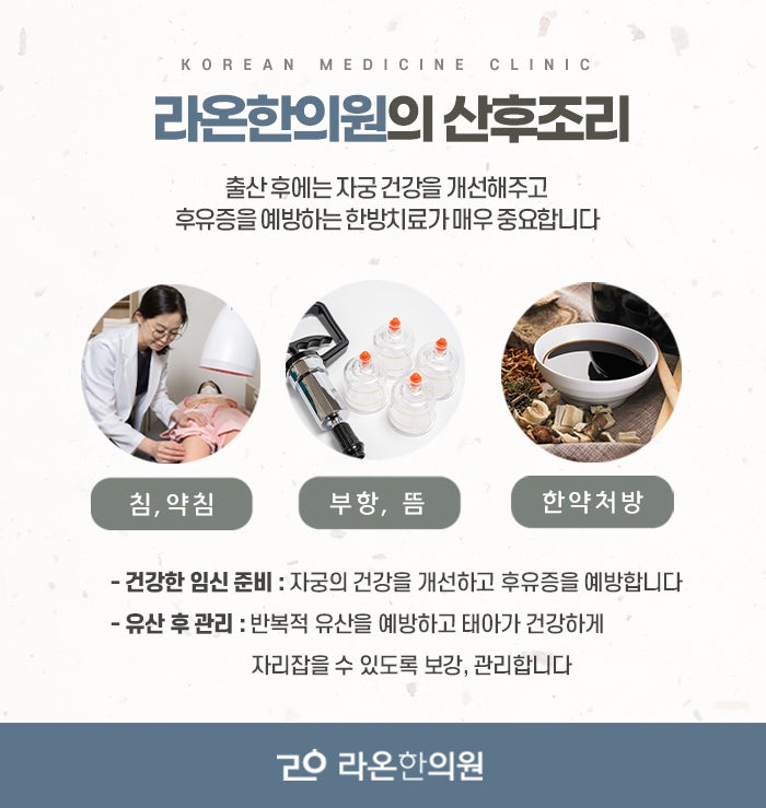 또한 대전산후조리한의원에서는 산후에 체내의 차가운 기운이 축적되는 것을 매우 경계합니다. 출산 후에는 땀이 많이 나고, 모공이 열려 있으며, 혈액 순환이 약해진 상태이기 때문에 찬 기운에 노출되기 쉬운데, 이때 냉기나 바람에 노출되면 관절통이나 냉증, 몸살과 같은 산후풍 증상이 나타날 수 있습니다. 산후 조리 중 식이요법도 매우 중요한 요소입니다. 출산 직후에는 소화력이 떨어져 있는 경우가 많기 때문에 기름지고 자극적인 음식은 피하고, 따뜻하고 부드러운 음식 위주로 섭취하는 것이 바람직합니다. 미역국은 대표적인 산후 음식으로, 미역에 풍부한 요오드는 자궁 수축과 회복을 도우며, 철분은 출산 후의 빈혈 예방에 도움이 됩니다. 또한 단백질, 칼슘, 비타민 등이 풍부한 음식을 적절히 섭취하고, 수분을 충분히 보충해주는 것이 중요합니다. 한편, 산후에는 적절한 휴식이 필수적이며, 무리한 집안일이나 육아는 피해야 합니다.