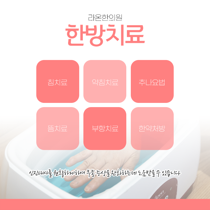 침치료는 부종이 나타난 영역에 직접적으로 기혈 순환을 활성화하고 혈액 흐름을 증진시켜 고여 있는 수분을 해소하는 데 도움을 줍니다. 부종으로 인해 발생하는 통증이나 저림 등의 증상을 완화하는 효과도 뛰어납니다.