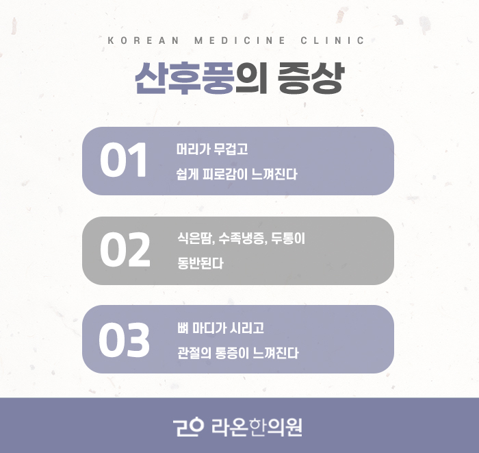 산후풍은 실제로 찬바람이나 찬 기운에 노출되어서 나타나기도 하지만, 한의학적 관점에서 이 질환의 의미는 찬바람이 든 것 같은 증상이 나타나고 빠른 속도로 진행된다는 의미입니다. 산후, 유산 후에는 면역력이 떨어지고 체온조절 능력이 떨어지게 되어 외부 자극에 대해 민감하게 반응하고 취약한 상태이므로 산후풍 증상을 겪게 됩니다. 아기를 낳고 난 뒤 임신과 분만에 의해 발생하였던 자궁, 골반 등 전신의 모든 기관의 기능이 서서히 회복되기 시작하여 임신 기간 이전의 상태로 돌아가는 기간인 산욕기에 나타날 수 있으며 산후풍으로 인한 통증은 단순 근골격계 치료에 비해 대전동구산후풍한의원의 한약치료를 병행할 때 더욱 좋습니다.