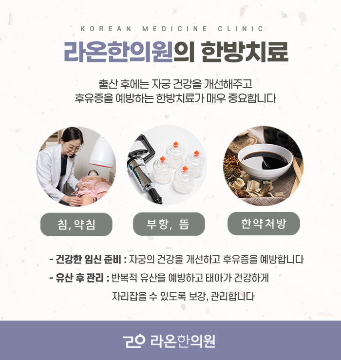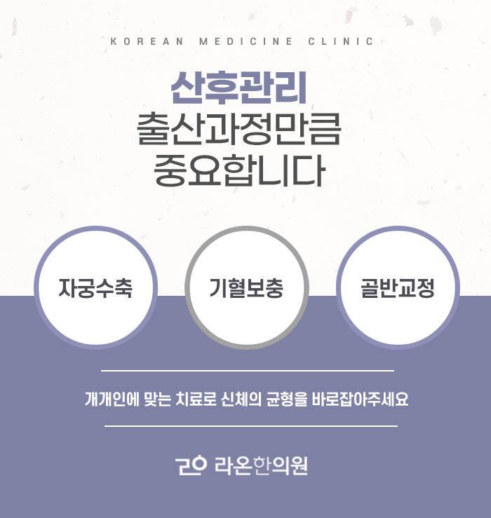 또한, 신진대사순환이 제대로 되지 않으면 통증이 더욱 심해지고 부종이 잘 빠지지 않기 때문에 기혈보충치료 또한 필요합니다. 임신 중 늘어난 체중이 빠지지 않아 산후 비만으로 이어질 경우 단순히 체중이 늘어난 문제뿐만 아니라 여러 가지 합병증의 위험이 증가하고 산후 우울증의 원인중 하나가 되기도 합니다.