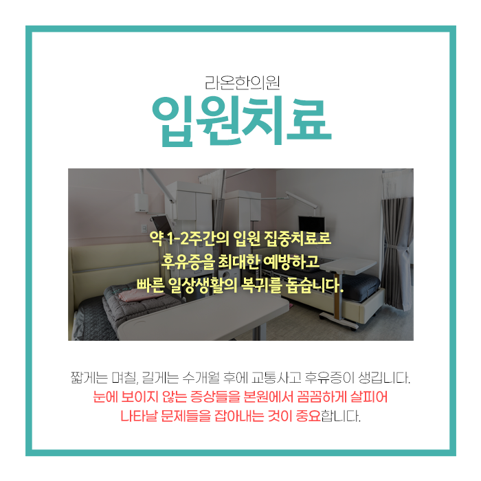 사고 후에는 통증이 경미하더라도 시간이 지남에 따라 증상이 악화될 수 있습니다. 신경이나 근육, 인대의 손상이 발생했을 가능성이 있으며 조기에 치료를 받지 않으면 만성적인 문제로 이어질 수 있습니다. 대전입원실한의원에서는 환자 증상과 상태를 면밀히 분석하여 치료를 제공하고 있습니다.