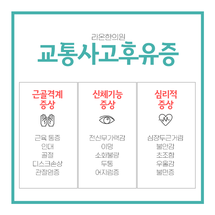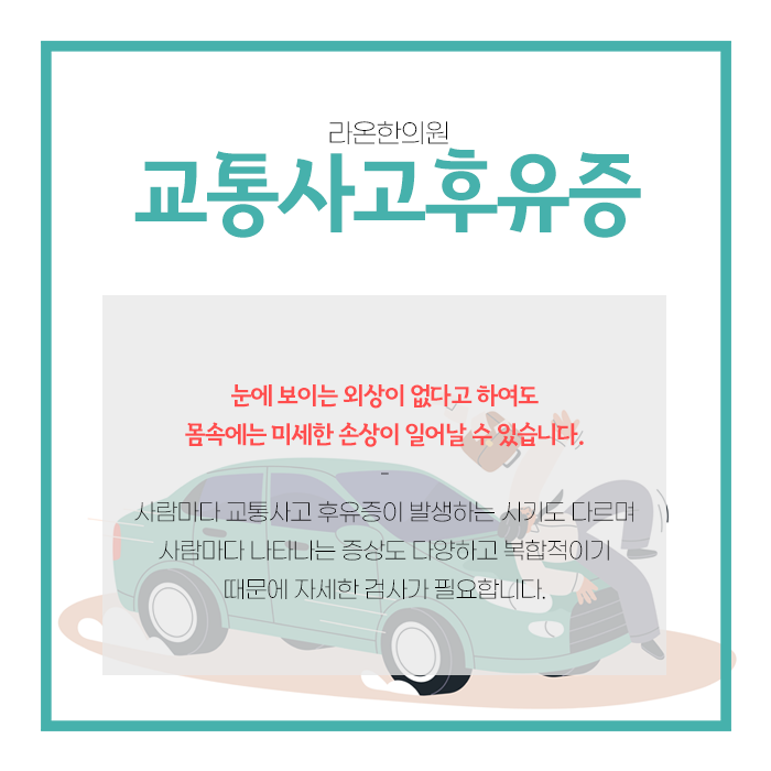 사고 직후에는 자신에게 나타나는 증상을 제대로 인지하지 못하고 지나치는 경우가 많습니다. 사고 후에는 일시적인 긴장감이나 스트레스를 느끼기 때문에 몸의 통증을 무시하거나 가벼운 증상이라고 생각하게 되는 경우가 많습니다. 그러나 나중에 알 수 없는 이유로 지속적인 고통을 초래할 수 있습니다. 초기 증상이 미약하더라도 방치할 경우 만성적인 문제로 발전할 가능성이 큽니다.